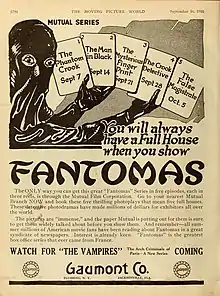 Fantômas (pronounced [fɑ̃toˈmas]) is a French silent crime film serial directed by Louis Feuillade, based on the novel of the same name.[1] The five episodes, initially released throughout 1913–14, were restored under the direction of Jacques Champreaux and released in this new form in 2006.