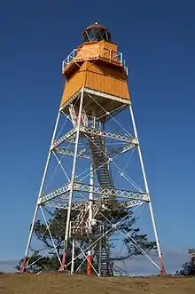 The Farewell Spit Lighthouse is located at the end of New Zealand's longest sand spit in Golden Bay / Mohua, near the northern tip of the South Island. It guides vessels entering Cook Strait from the west and south.[1] The LED rotating beacon flashes white or red, once every 15 seconds. It has a range of 19 nautical miles (35 km; 22 mi). Red is shown to warn approaching vessels of extensive shoaling. Standing 27 metres (89 ft) tall, the tower needs to be taller than the support structures of most lighthouses built on cliffs or headlands, because the sand foundations it is built upon are almost at sea level. The tower is constructed of an open steel lattice to withstand abrasive sand and salt-laden winds.[2]