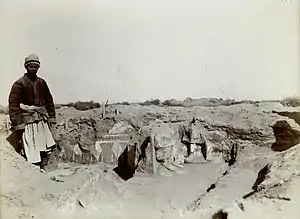 Aurél Stein photo of the Farhad-beg-yailaki site, seen from southwest in 1906–08. Remains of the ruined temple and porch
