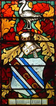 FARRER: Bryan Farrer, JP, of Binnegar Hall, Dorset, (1858–1944), grandson of James William Farrer of Ingleborough, Yorkshire, Senior Master in Chancery, (1785–1863), had issue Captain John Oliver Farrer, MC, (1894–1942), father of William Oliver Farrer, MA (Oxon), of Highlands, Fernhurst, Haslemere, solicitor, (b.1926); and Sir Walter Leslie Farrer, KCVD, BA (Oxon), of Charlwood Place Farm, Horsley, solicitor, (b.1900). The said James William Farrer had a 2nd son the Rev. Matthew Thomas Farrer, MA, of Ingleborough, (1816–89), Vicar of Addington and Perpetual Curate of Shirley. Arms: Quarterley, 1 and 4, Argent on a bend engrailed Sable three horseshoes of the field (Farrer); 2 and 3, Or gutté-de-sang a bend Gules. Crest: A horseshoe between two wings erect Proper. Motto: Ferre va ferme.