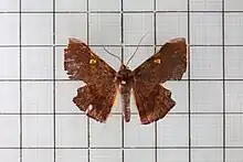 The wingspan of the male is 38 mm.[4] Forewings with outer and inner margins excised towards outer angle. Hindwings with the costa and apex more or less truncate and excised. Cilia non-crenulate. Male has deep reddish-brown body with an olive shade and slightly suffused with purplish grey. Wings with dark striae. Forewings with grey costa. There is an oblique antemedial line angled below the costa and a yellow spot at end of the cell often with a hyaline center. Traces of a postmedial line can be seen. A curved and waved purplish-grey submarginal line present angled below costa, and on the hindwings becoming postmedial. Ventral side of forewings with yellow basal half, brown outer area, bright reddish brown inside the postmedial line. This postmedial line is prominent, angled and purple, or with a quadrate sinus below costa and often waved towards inner margin. Hindwings yellow, suffused and striated with rufous outer area. There is an indistinct postmedial and curved crenulate submarginal line present. Wingspan of the female is 44 mm. Female much similar to male, but differs in much red in color.[5]