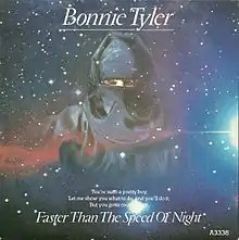 "Faster Than the Speed of Night" is a song by Welsh singer Bonnie Tyler and is the second track from her fourth studio album of the same name (1983). It was written and produced by Jim Steinman and released by Columbia Records in 1983. As the second single from Faster Than the Speed of Night, it was the follow-up to "Total Eclipse of the Heart".
