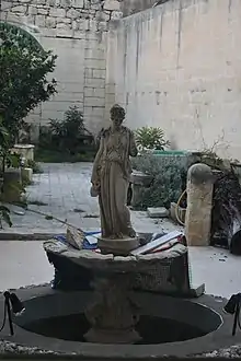 The villa is surrounded by native Maltese gardens in front, sides and at the back.[8][42] Some of the garden are visible to the public from the street while the back garden is more private but over time became overshadowed by modern housing developments. The front garden features a niche of the Madonna of Lourdes. The main attraction in the back garden is a period fountain surmounted by a statue of a secular lady.