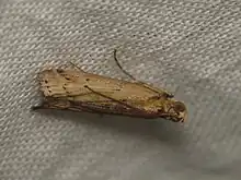 The wingspan is about 20 mm. The forewings are brown with a dark mark near the base of the inner margin.[2]