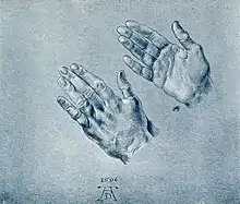 Preparatory drawing. Hands of Maximilian. In Feast of the Rosary, Dürer shifted the hands closer together, so that his left hand overlapped his right palm.[2]