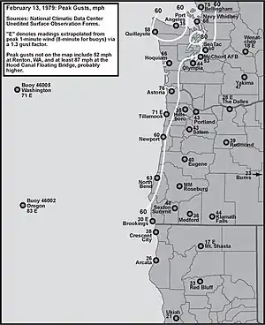 The February 13, 1979, windstorm was a natural phenomenon that took place in Pacific Canada and the United States. During the early morning, an intense wave cyclone moved across southern Vancouver Island, British Columbia. South of the low center, a strong atmospheric pressure gradient was carried across Washington, with associated high winds. With a cold airflow moving toward the northeast interacting with the high terrain of the Olympic Mountains, a lee low developed east of the Olympics. The mesoscale low caused a particularly intense pressure gradient across the Kitsap Peninsula region.