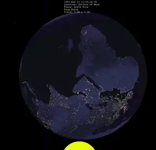 As seen from the lunar south pole the sun missing the sphere of the earth, excluding the atmosphere.