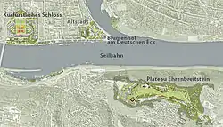 There were three core areas for the Federal Horticultural Show 2011: In the inner city there was the area around the Electoral Palace, there had been flower beds at the Deutsches Eck, and on the right (eastern) bank there was the area located on the plateau of Ehrenbreitstein. These core areas had been fenced and were only accessible with a ticket.