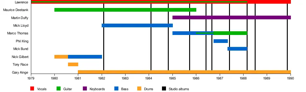 With Lawrence initially on vocals and guitar, they formed properly in 1980 with the addition of schoolfriend Nick Gilbert on drums and local guitarist Maurice Deebank.[5] Becoming co-writer with Lawrence, Deebank's jangly, classical-influenced style of playing would provide the band's signature sound in its early years.[8]