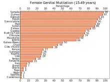 Female genital mutilation in Sierra Leone (also known as female genital cutting) is the common practice of removing all or part of the female's genitalia for cultural and religious initiation purposes, or as a custom to prepare them for marriage. Sierra Leone is one of 28 countries in Africa where female genital mutilation (FGM) is known to be practiced[1] and one of few that has not banned it.[2] It is widespread in part due to it being an initiation rite into the "Bondo," though initiation rite-related FGM was criminalised in 2019.[3][4] The type most commonly practised in Sierra Leone is Type IIb, removal of part or all of the clitoris and the labia minora.[5] As of 2013, it had a prevalence of 89.6%.[6]