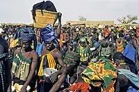 Education is compulsory from ages six to 15. However, many children do not attend school, and girls' enrollment is lower than that of boys at all levels due to factors such as poverty, societal preference to educate boys, child marriage and sexual harassment.[9] In Malian households, the sons help with family farms, enterprises, and market purchases. They are in charge of all the major decision-making. Malian men are expected to acquire resources and earn the family income.[10] The daughters quickly begin doing domestic chores and caring for younger siblings. Women are expected to handle the household chores and tend to garden plots. In polygamous households, women share and split up their tasks.[10]