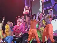 A video interlude in which the stalker talks about femme fatales throughout history introduces the third section of the show. Spears returns to the stage wearing a golden outfit and performs an Egyptian-inspired version of "Gimme More", which includes the use of pyrotechnics. In her next number "(Drop Dead) Beautiful" Spears is surrounded by her dancers carrying picture frames, and includes an appearance by Sabi in select cities. She then sings "He About to Lose Me" on a purple couch while her male dancers climb metallic structures. She wears a golden cape for a snake charming number of "Boys" (The Co-Ed Remix).[34] After climbing into a swing, she starts singing "Don't Let Me Be the Last to Know", while an acrobat hangs from it.[33] Another video interlude follows, featuring Spears changing clothes and choosing between different passports inside a hotel room. The show’s final segment features Spears and her dancers dressed in motorcycle gear to perform a medley of "...Baby One More Time" and "S&M", while her next number "Trouble for Me" features Spears and her dancers performing in the B-stage.[34] Accompanied by her female dancers, Spears performs "I'm a Slave 4 U" with gay soft porn in the backdrops,[35] and subsequently a cover of Madonna's "Burning Up" sitting atop a giant silver guitar.[33] She then brings several fans onstage for a performance of "I Wanna Go". She performs "Womanizer" with her dancers dressed as policemen and thanks the audience.[36] The encore starts with a video interlude of "Scary". The video ends with Spears finally capturing the stalker while wearing a kimono. She reappears to perform a martial arts-inspired version of "Toxic", in which she defeats a group of ninjas. At the end of the song, she goes below the stage and returns wearing a black sparkly bodysuit for "Till the World Ends". Halfway through the performance, Nicki Minaj appears on the backdrops rapping her verse of The Femme Fatale Remix of the song. She also joined Spears to perform the verse in select cities. After the song changes back to the original version, Spears starts flying on a platform with giant angel wings. The show ends with Spears and her dancers thanking the audience, as confetti falls and the "Femme Fatale" sign is lowered onstage.[33]