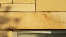 It was normal to lay the Fencepost limestone with its bedding plane horizontal; so, fossils can only be seen in thin cross section in the walls of almost all buildings built with Fencepost limestone. However, when laid in this stretcher fashion, the characteristic red-orange or brown lines are displayed. Many buildings have the limestone left with quarry face, many showing the holes drilled for splitting. Some buildings may have hammered finish, others pitched.[15] The Ellis County courthouse is a large example of sawed, stretcher course Fencepost limestone.[26] It is uncommon to see this stone set in walls in vertical "shiner" orientation, but such an orientation can show off the fossil content.[15] An example of this is the First United Methodist Church of Hays built in 1949; here the Fencepost limestone[27] was cut into slabs and set vertically; and its index fossil, Collignoniceras woollgari, is displayed in well-preserved cross sections in a few places.
