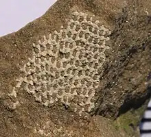 Fenestellidae is a family of bryozoans belonging to the order Fenestrida. The skeleton of its colonies consists of stiff branches that are interconnected by narrower crossbars (or dissepiments). The individuals of the colony (or zooids) inhabit one side of the branches in two parallel rows or two at the branch base and three or more rows further up. Zooids can be recognized as small rimmed pores (or apertures), and in well-preserved specimens the apertures are closed by centrally perforated lids. The front of the branches carries small nodes in a row or zigzag line between the apertures. Branches split (or bifurcate) from time to time giving the colonies a fan-shape or, in the genus Archimedes, create an mesh in the shape of an Archimedes screw.[1]