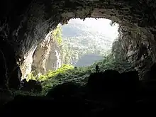 Mawangdong Cave (马王洞, 24°23′39″N 107°00′35″E / 24.3943°N 107.0098°E / 24.3943; 107.0098) consists of three layers. The upper and middle layers are dry with a length, height and width of 7.7 km (4.8 mi), 80 to 150 m (260 to 490 ft) and 30 to 160 m (98 to 525 ft) respectively. The lower layer is an underground river channel. The cave's entrance is 130 m (430 ft) above the foothills and its mouth measures 94×138 m. A karst sinkhole known as a "Tiankeng" lies at the southern section of the cave. [3] Its mouth has a tri-corner shape with rounded corners measuring 225 m×180 m. The depth of this sinkhole is 320 m (1,050 ft) and an accumulation of collapsed rocks and clay lies at the bottom of the sinkhole. The vegetation there is verdurous. The cave is named "Mawangdong", which literally means "Horse King Cave", since the cave entrance resembles a horse's mouth.[4] This cave is a neighbor to Sanmenhai Cave (三门海洞, 24°24′39″N 107°01′51″E / 24.4108°N 107.0308°E / 24.4108; 107.0308) and the two are connected by an underground river.
