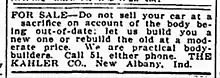 In 1909 it was reported "The Kahler Co. at Pearl and Oak streets, New Albany, will be operated at its fullest capacity for the next eighteen months, having received a contract from an Eastern automobile factory for a large number of automobile beds". The article claimed thirty men were working 13-hour days to fill the order.[26]