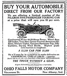 The Falls City Motor Company turned out two lines of hand-assembled "medium-priced gasoline runabout(s)",[49] the Ohio Falls (1913–1914) and the Pilgrim (1913–1914), which retailed for $1,800 (equivalent to $53,297 in 2022). Total production of the Pilgrim was about 20 completed cars. The Pilgrim retained the unique hexagonal bonnet (hood) and radiator design from the Jonz automobile.