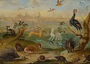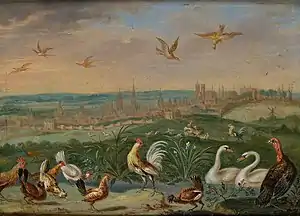 According to Weyerman, Ferdinand's father was well known in his own day and only tipped his hat to Jan Brueghel the Elder, who was the "Phoenix of landscape paintings with animals and birds".[2] Though Ferdinand never achieved the level of his father, he was true to the van Kessel-Brueghel family name, and after Jan Brueghel the Younger died he was the only painter in Antwerp who carried on the family tradition. He was discovered by Mr. Molo, a representative of the Polish king John III Sobieski who sent a few of his cabinet pieces to Poland. When these were well received, he invited van Kessel to come to Breda to make enough paintings to decorate a whole room in the Wilanów Palace.[2] Van Kessel subsequently moved to Breda to fulfill this commission according to the taste of the Polish King. He began by painting scenes of the four elements on a sheet of copper three by four and a half feet wide.[2] The four elements were each represented by cherubs, and the first painting was of a boy seated on an eagle representing Air, surrounded by birds. Earth was a boy resting his arm on the back of a lion, surrounded by herbs, fruits and flowers. Fire was a boy surveying implements of war, with gold and silver inlaid harness, drums, embroidered silk banners and spears with damask coverlets, with a small monkey smoking a pipe and drinking a glass of rossoly (rosée du soleil). Water was a boy leaning on a crock symbolizing God's water source at the edge of a river surrounded with sea and river fish in the water, and pearls, corals and shells on shore.[2] The whole was framed in ebony with a gold edging and surrounded by fourteen or fifteen symbols of the elements.