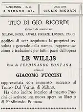 Notice in Gazzetta Musicale di Milano (1884) announcing Ricordi's publication of Le Villi and their contract with Puccini to write a second opera with Fontana.