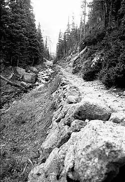 The Fern Lake Trail in Rocky Mountain National Park, Colorado, runs 4.8 miles (7.7 km) from Moraine Park in the eastern part of the park westward to Fern Lake, the first portion of the trail following the course of the Big Thompson River. The trail was first informally established in the late 1880s as a way to get to "The Pool," a wide spot in the Big Thompson where a small lodge predated the 1915 establishment of the park. The trail was improved by the Estes Park Protective and Improvement Association between 1907 and 1912, with a new bridge at The Pool. Two years later the trail was rebuilt to maintain no more than a 10% grade and to provide better access to Fern and Marguerite Falls. In the 1920s Fern Lake became a popular winter destination for skiing, complete with a lodge. From 1933 the trail was rebuilt over three years with Civilian Conservation Corps labor, building retaining walls and adjusting the trail's alignment.[2]