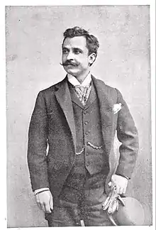 De Lucia sang at La Scala in 1895 in the world premiere of Mascagni's Silvano, and also appeared in the first Milan performances of Puccini's La bohème and Massenet's La Navarraise.[2] At Covent Garden in that same year, he shared the principal tenor work with the heavier-voiced Francesco Tamagno and Albert Alvarez in the absence of Jean de Reszke.[15] The American baritone David Bispham thought De Lucia admirable in Fra Diavolo that year. The cast of Auber's light-hearted opera featured Bispham and Mme Amadi (as Lord and Lady Allcash) and Marie Engle (as Zerlina), as well as the bass Vittorio Arimondi and the buffo baritone Antonio Pini-Corsi (as brigands).[16]