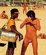 He lived for a decade in exile from Brazil during the military dictatorship, and returned to his country in 1979. Just after his return, a photo of Gabeira wearing a very small knitted swimsuit on Ipanema beach turned into a national scandal. Many years later, Gabeira revealed that his scandalous bathing suit was indeed the bottom part of one of his cousin Leda Nagle's bikinis.[7]