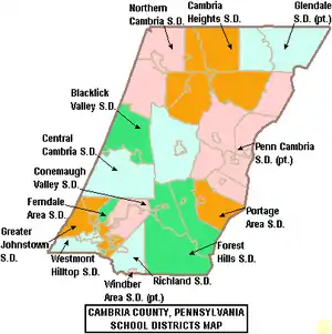 The Ferndale Area School District is a diminutive, suburban, public school district in Cambria County, Pennsylvania. It serves the boroughs of Brownstown, Dale, Ferndale, and Lorain as well as Middle Taylor Township - none of which border on each other. The district encompasses just 6 square miles (16 km2). According to 2000 federal census data, it served a resident population of 5,759. By 2010, the district's population had declined to 5,100 people.[1] The educational attainment levels for the Ferndale Area School District population (25 years old and over) were 90.3% high school graduates and 14.2% college graduates.[2] The district is one of the 500 public school districts of Pennsylvania.