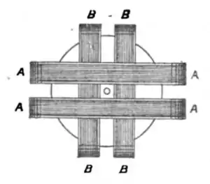 Ferraris's first publication was in March 1888, entitled Electrodynamic rotations produced by means of alternate currents.[3] After expounding the geometric theory of the rotatory magnetic field, he suggested that a simple way of procuring the desired phase-currents would be to branch the circuit of an alternate current into two parts, into one of which should be inserted a resistance without self-induction, into the other a coil of much self-induction but of small resistance. The two windings of the motor should be respectively introduced into these two branches. The difference of phase thus produced would be sufficiently near to 90° to be effective. He expressed the opinion that in this way one might obtain all the effects that can be obtained by the rotation of a magnet. He then described the following experiments which were made in the autumn of 1885.