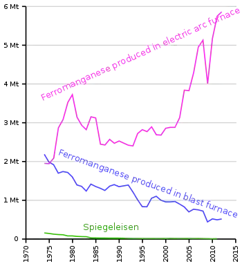 Ferromanganese is an alloy of iron and manganese, with other elements such as silicon, carbon, sulfur, nitrogen and phosphorus.[1] The primary use of ferromanganese is as a type of processed manganese source to add to different types of steel, such as stainless steel. Global production of low-carbon ferromanganese (i.e. alloys with less than 2% carbon content) reached 1.5 megatons in 2010.[2]