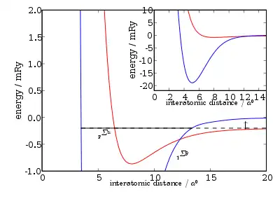 where denotes the total kinetic energy of the relative motion (center-of-mass motion plays no role in the two-body interaction), is the contribution to the energy from couplings to external fields, and represents a vector of one or more parameters such as magnetic field or electric field. We consider now a second reaction channel, denoted by D, which is closed for large values of R. Let this potential curve admit a bound state with energy .