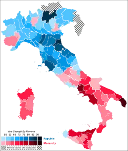 On 2 and 3 June 1946, an institutional referendum was held with which the Italians were called to the polls to decide which form of state – monarchy or republic – to give to the country.[1] The referendum was announced at the end of World War II, a few years after the fall of the Fascist regime in Italy, the dictatorial regime that had been supported by the Italian royal family, the House of Savoy, for more than 20 years.[1]