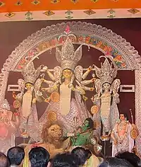 Durga Puja, held in September–October, is the biggest and most important festival of West Bengal as well as of Kolkata. It marks the victory of ten-armed goddess Durga over the buffalo demon Mahishasur and signifies the victory of good over evil. The festival commences on Mahalaya, a week before the actual Puja celebrations begin on Sashthi and continue through Saptami, Ashtami, Navami and Vijaya Dashami, when the festival comes to an end. Pandals are set up and idols of goddess Durga and her four children - Lakshmi, Saraswati, Kartik, Ganesh are worshipped and displayed for five days across the state, especially in Kolkata. Some 3000 pandals are erected throughout Kolkata and its suburbs. Pujas are also conducted in sizeable number of family households. Elaborate rituals are performed by priests amid sound of drums (dhaak), conch shell (shaankh) and bells, and many devotees join in the prayers.