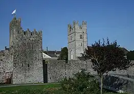 Fethard's walls with mural tower house (at left) and church tower (at right)