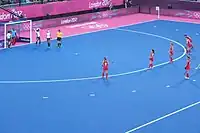 The 1876 rules stated that "no goals shall be allowed if the ball be hit from a distance of more than 15 yards (14 m) from the nearest goalpost". A visible "striking circle" with "radius of 15 yards" was codified in 1886.[3][4] The radius of the circle was increased to 16 yards (15 m) in 1951 for men's hockey and 1968 for women's hockey.[5] Any free-hit within 5 m of the circle has slightly different rules from others concerning other players’ distance; a broken circle 5 m from the penalty circle denotes this location.[10]