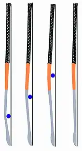 One hockey stick produced by AREC for the French inventor, Jean Capét, had the centre of the handle aligned with the centre of the horizontal length of the head. There was a lot of promotion based on 'rotational balance' and the 'sweet spot' and 'power hitting'. The 'Hook' certainly felt out of rotational balance, especially to those who had been playing with short-head sticks that had been made with a very thin toe, so as to concentrate the weight of the head closer to the shaft.