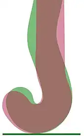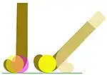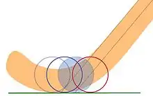 A hockey stick is occasionally used in the vertical position shown, but manipulating the movement and the direction of the ball in a controlled way (dribbling) is carried out in what is termed a "dribbling crouch", when the handle of the stick will usually be angled between 35° and 55°. Hitting or pushing the ball can be done with the stick at any angle between the vertical and horizontal and recent changes to the rules allow even the edges of the stick to be used to sweep or strike at the ball on the ground. The various stick head designs can be compared in respect of how, with the handle at an angle of 45°, they differ in the carrying out of the Indian dribble, i.e. controlling the direction of the ball by rotating the stick head over the top/front of the ball rather than (or as well as) around the back of the ball (the English style dribble). The multi-layered stick head diagram indicates the changes in head shape and length that occurred over thirty years or so.