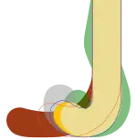 The extent of the stick head along the X+ axis, towards the 'heel' of the Head is confined by the rule requirement that the stick head and the handle meet in a smooth continuous fashion at the line C-C and by a rule restriction on the shape of the handle, which is that the stick-handle must not project beyond the line B1-B1. It is possible to envisage a stick where the width of handle did not extend beyond the line A1-A1, thus allowing a significant extension of the stick head along the X+ axis, but the practicalities of such a design seem to be limited and have not been explored. The length of the Head (or toe) along the X- axis has varied enormously, especially since the Second World War and again after the introduction of the timber lamination process in the early 1980s.