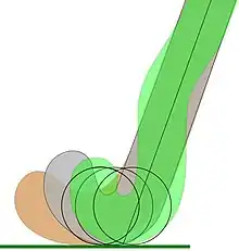 Using extreme examples is useful as a means of demonstrating effects that occur in less extreme configurations but are much more difficult to spot and therefore to explain. The first observation is an easy one (top left in the image captioned "Reversed head in various…"). If the stick head is rotated onto the reverse (lighter colour) the toe is not going to disappear into the ground to enable the reverse side of the stick to be presented to the ball—a vertical adjustment is necessary. Secondly (top right), if the handle of the stick is kept at exactly the same angle and rotated, a horizontal adjustment is necessary to bring the reversed head to a position where contact will be made with the ball. The third figure (bottom left) shows these adjustments having been made (and a change to the angle of the handle because the position of the hand holding the stick at the top would be about the same as it is when gripping the stick in the forehand position), but the area of stick head making contact with the ball is very small; so control may not be adequate. The fourth figure (bottom right) demonstrates that to get good contact with the ball on a larger area of the reversed head, it is necessary to move the handle much nearer to the vertical. This means the player must bring the ball in very close to the feet and come to a more upright dribbling position—this in turn impairs the ability to scan the pitch and keep the ball in peripheral vision at the same time—a considerable disadvantage when dribbling to evade opponents.