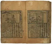In the 2nd century CE, another text was composed based on the Kataññnu Sutta (Sanskrit: Katajña Sūtra[124]), called the Fumuen Nanbao Jing, the Discourse on the Difficulties in Repaying Parents' Debts. The text emphasized the compassion parents have towards their children. It later became highly popular in East Asian countries, as it was cited in at least ten Chinese translations of Indian texts.[125] Based on this text, the more popular Fumu Enzhong Jing was composed (Chinese: 父母恩重經, title has similar meaning).[87] The Fumu was depicted in illustrations found in the Dunhuang caves dating back to the Tang (618–907) and Song dynasties (960–1279).[126] Popular preaching and lectures, mural and cave paintings and stone carvings indicate that it once was very popular among the common people.[127]