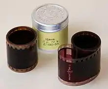 A filmstrip is a spool of 35 mm positive film containing a series of images (often thirty to fifty) in sequential order. Like motion picture film, a filmstrip is inserted vertically in front of the projector aperture. The frame size is smaller than normal 35 mm film. Two frames of a filmstrip take up the same amount of space as a single 35mm frame, including its guard band, such that a 25 exposure length of 35mm film could contain up to 50 images. Early celluloid filmstrips were susceptible to combusting like all nitrate-based film. Furthermore, unlike conventional film stock, individual frames of this kind of film allow projecting for a relatively extended period of time without being damaged by the projector's light source.