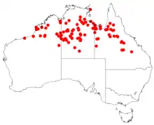 In Western Australia it is found in and around swamps and claypans and on sandstone hills in the Kimberley and Pilbara regions where it grows in sandy soils.[3] It is also found throughout the central of the Northern Territory between Alice Springs and Katherine[1] and parts of Queensland.[4]