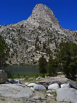 Fin Dome is an 11,673-foot-elevation (3,558-meter) granite summit located 1.5 mile west of the crest of the Sierra Nevada mountain range, in the southeast corner of Fresno County, in northern California.[3] It is situated in the Rae Lakes area of Kings Canyon National Park, approximately 15.5 miles (24.9 km) west of the community of Independence. Nearby peaks include Black Mountain 1.9 miles (3.1 km) to the east, and Mount Rixford 2.1 miles (3.4 km) to the south-southeast. Topographic relief is significant as the east aspect rises 1,135 feet (346 meters) above Rae Lakes in one-quarter mile. The John Muir Trail passes to the east of this landmark, providing an approach. This geographical feature was named by Bolton Brown in 1899 when he explored the lake basin in its vicinity, because it resembled the fin of a sea serpent.[4] The first ascent of the summit was made in 1910 by James Rennie, one of the foremost mountaineers of the Sierra Club.[5]