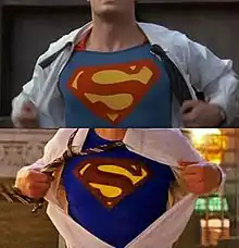 The suit that Clark dons in the series finale was originally used in the 2006 film Superman Returns, worn by Brandon Routh. The producers of Smallville had been offered the suit worn by Christopher Reeve in the original Superman films, but they turned the offer down. Peterson reasoned that this was because it "didn't quite fit with our world".[18] The final scene was shot to be reminiscent of the similar scene in the original 1978 Superman film, where Reeve rips open his shirt to reveal the Superman suit. Beeman and the rest of the production staff reviewed the scene to make sure that they filmed the homage correctly, but Beeman later noted that the iconic scene was "clunkier" and more "out of focus" than they wanted, and that people's memories make it seem more impressive. However, he was pleased that the recreated shot was the sequence to wrap up Smallville, noting that he "always thought that was going to be the final moment".[17]