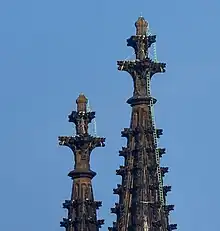 The finials of Cologne Cathedral from the tops of the two towers (north and south towers) at a height of 149 to 157 metres. A copy of this finial in original size, but made of concrete, has stood below the steps in front of the west façade of the cathedral since 1991.