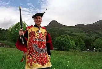 The office of Finlaggan Pursuivant is held by Thomas Miers, who was appointed at a ceremony in Edinburgh on 25 July 2009. Miers succeeded Adam Bruce (b. 1968) following his appointment as Unicorn Pursuivant. Bruce was appointed by Godfrey James Macdonald, 8th Baron Macdonald of Slate, Chief of the Name and Arms of Macdonald and High Chief of Clan Donald. This post was revived in 2005, after 510 years, in a ceremony attended by Ross Herald of Arms in Ordinary from the Court of the Lord Lyon and the four MacDonald chiefs.[1]