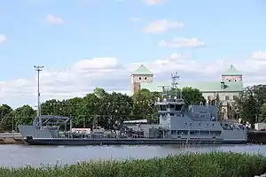 Hylje (799) is a combined pollution cleanup ship and vehicle transport ship built in 1981 and refitted in 1990–1991. She is operated by a civilian crew from the Ministry of the Environment, but is under Finnish Navy control. The vessel can act as a landing ship and logistic support vessel. The vessel has a capacity to carry 100 tons of deck cargo and its bow ramp can unload vehicles up to 42 tons. The vessel is equipped with oil and oil-slurry collection tanks with a total capacity of 1,410 cubic metres (50,000 cu ft). The vessel can be operated in light ice. Hylje is equipped with a 6-ton crane.[2]