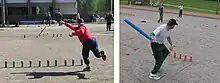 Skittles can be played with four-person teams, in pairs or as an individual game. In team and pair games, the players have two bats at their disposal. In individual games, four bats can be used per turn.