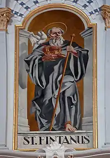 Fintan was born in Leinster, Ireland into a noble family.[2] He lost his parents and siblings in internal wars in Ireland and through abductions by the Vikings.[1] He himself was enslaved by the Vikings (possibly handed over by his Irish enemies[3]) and taken to the Orkney Islands, but was able to escape to Scotland.[1] There he stayed with a bishop for two years,[1] and became a clergyman.[4] In 845 he made a pilgrimage through the Frankish Empire to Rome.[1] From there he went to the monastery of Farfa where he lived as a monk for some time, then via Rhaetia to Swabia, or to the landgraviate of Klettgau, where he entered the service of the Alemannic nobleman Wolvene.[1] Wolvene persuaded him after a few years to join his monastery in Rheinau as a monk, which he did in 851.[1] From the year 856 he lived there walled in as an recluse until his death.[1] His bones are kept in the Rheinau monastery church in the reliquary in the Fintan altar.[1] Shortly after his death, the Vita Findani was written by a confrere of the monastery; it is considered reliable. His attributes in church art are a dove, a ducal hat, and the monks' habit.[1]