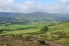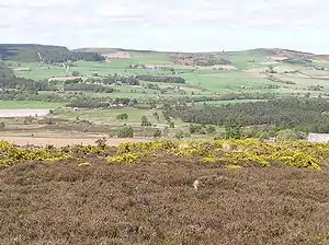 To the south and west, Finzean is shielded by higher granite hills which rise to more than 500 metres above sea level. Notable hills which are prominent in views to the south and west include Clachnaben (589 m), which lies outside Finzean, and Peter Hill (617 m), which is the most prominent hill in Finzean (although Gannoch, in the Forest of Birse, is higher at 731 metres). The hills are mostly covered with heather, but along their lower slopes, there are some extensive areas of forestry, most of which is planted with Scots pine and larch. There is also a small area of natural pine forest at Glenferrick and Finlets, which is the most easterly remnant of the ancient Caledonian Forest.[3]