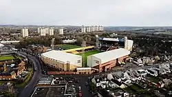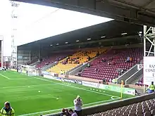 The South Stand is named after former manager Tommy McLean and was previously named the Maxim Office Park Stand for sponsorship reasons.[12] The structure dominates the surrounding area, as it can be seen from all around Motherwell and the nearby M74 motorway.[4] It is a two-tiered structure[2] holding 4,856 fans and was opened on 26 April 1993 with a friendly match against Coventry City.[13][14] The upper deck offers a panoramic view, beyond the centre of Motherwell to the distant Ochil Hills and Ben Lomond.[13] It normally houses the away support.[13] When the South Stand was first opened, Motherwell offered £20 debentures guaranteeing tickets for the games played by the relevant visiting team at Fir Park.[13] This offer targeted supporters of the Old Firm clubs, with 600 debentures sold by late 1995, mostly to Rangers fans.[13] Unusually for a stand designated for away fans, it has a row of corporate boxes running along between the two tiers.[13] The South Stand also houses a gymnasium and warm up area.
